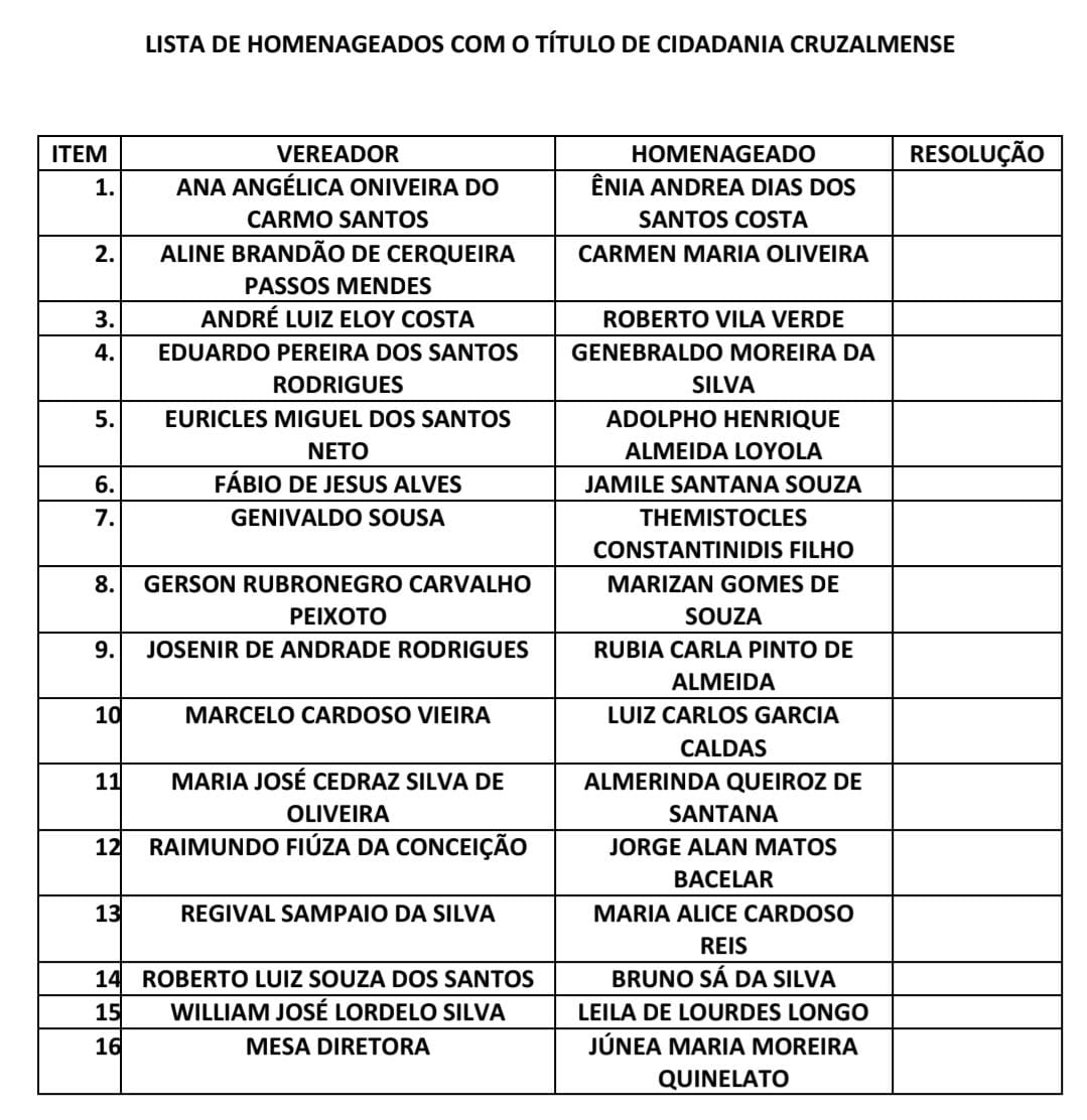 A Câmara de Vereadores de Cruz das Almas realizará, na próxima quarta-feira, 01 de outubro, às 19h, uma Sessão Solene em homenagem ao dia do Vereador com a entrega do Título de Cidadania Cruzalmense. Durante a cerimônia, 16 personalidades que se destacaram por suas contribuições à cidade serão homenageadas com o título, incluindo um homenageado da Mesa Diretora.