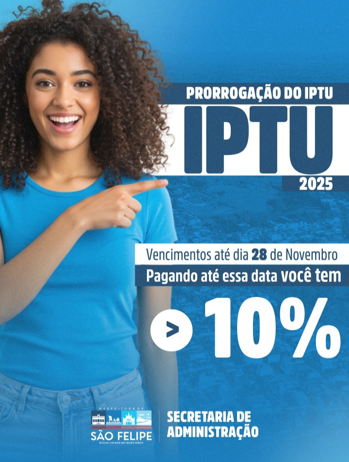 A Prefeitura de São Felipe, por meio da Secretaria de Administração, informa que o prazo para pagamento do IPTU é até o dia 28 de novembro.