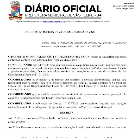 O prefeito de São Felipe, Antônio Gregório de Oliveira Barbosa, publicou nesta sexta-feira (28) o Decreto nº 483/2025, determinando a redução de 50% do subsídio do prefeito, vice-prefeito e de todos os secretários municipais no mês de dezembro.